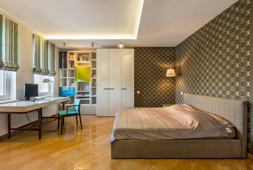 Experts do not recommend using finishes with clear patterns that repeat on all walls. If you cannot avoid such a solution, you can resort to it only partially. In this case, the wallpaper is glued to only one of the walls, while the rest of the surfaces are made out in calmer colors.