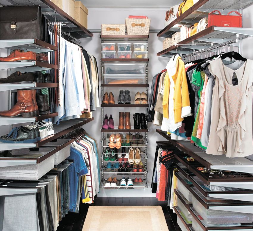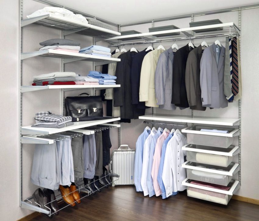 Complexes for system storage of things from the Swedish company Elfa are sets of standard guides and elements that are easily connected to each other. System components can be interchanged, supplemented depending on your needs. A huge assortment of components (including racks, containers, baskets) allows you to assemble a structure for a bedroom, kitchen, hallway or separate dressing room.