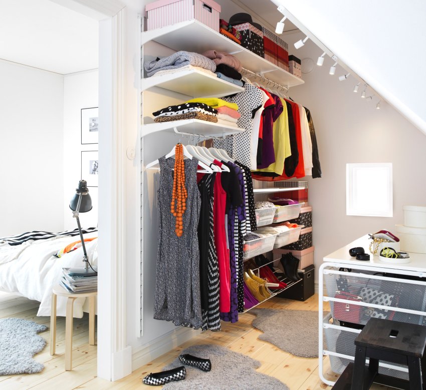 The Stolmen series of storage complexes with height-adjustable racks allows the use of structures, taking into account any height of the dressing room. Ikea manufactures such storage systems with racks ranging from 2.1 to 3.3 m in length. Another advantage of such complexes is their incredible mobility: the structures are easily mounted and, if necessary, quickly disassembled for transfer to another place.