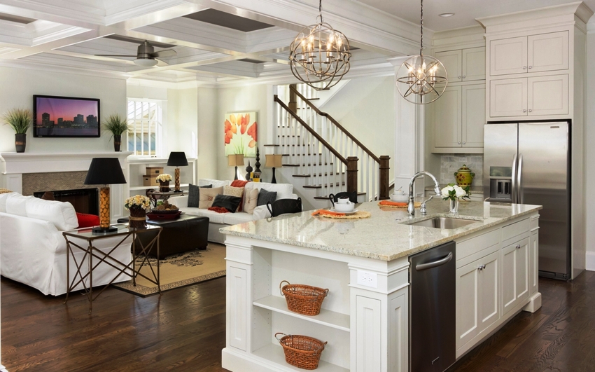 - Combining space. In the photo of real objects of modern classics in the interior, there is a lack of zoning of space with the help of walls. The main principle is to combine small rooms into one spacious room, which serves as a living room, dining area and relaxation area. In this case, it is recommended to refuse extra doors.