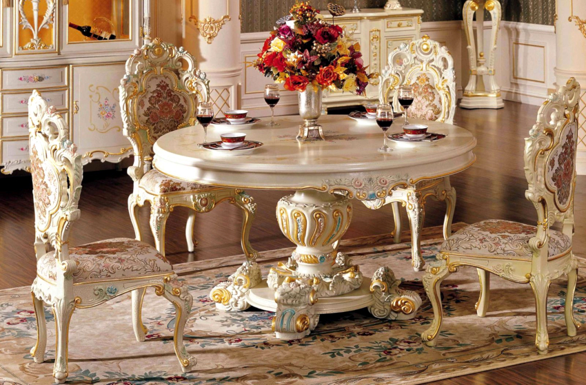 Furniture items are distinguished by openwork bends. There should be decorative gilding here. Smooth lines, expensive materials and high-quality workmanship give graceful refinement to the style. Fancy weaves, complex decorative carving are welcome.