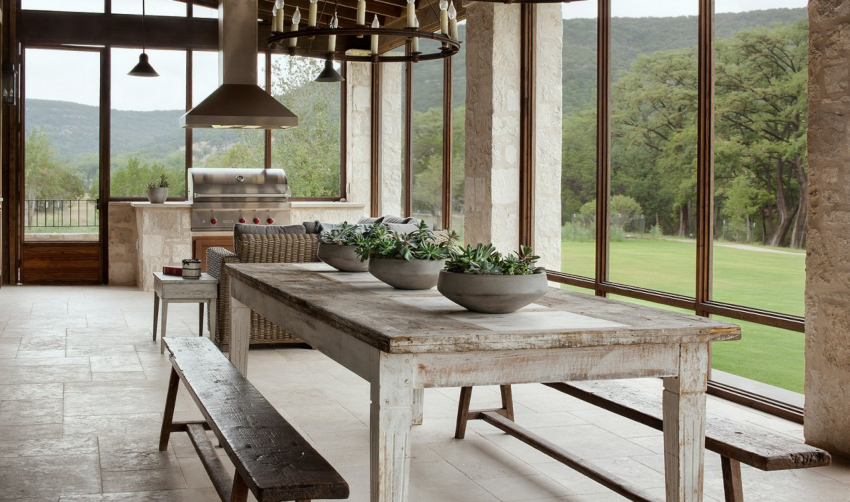 A massive wooden table should have a round or rectangular shape with solid reliable legs that will provide the structure with stability and the ability to withstand heavy loads. The chairs need to be comfortable, with a wide padded seat and backrest, without armrests. Wicker benches look organic.