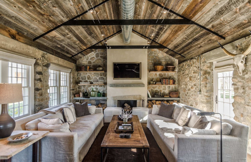 Walls, ceilings and floors are decorated exclusively with natural materials, which emphasize the naturalness and closeness to nature. This is clearly shown in the photo of the rustic style in the interior. The main place is given to wood and stone. Textiles are also selected exclusively from natural materials in the form of linen, cotton, cambric and chintz, thanks to which the room is filled with lightness and freshness. The decoration should be simple, without pretentiousness. Handicrafts are encouraged and can be accentuated for a simple interior. The use of monograms, stucco molding and gilding is excluded here.