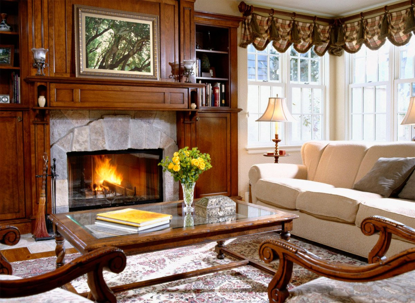 In the living room, the characteristic features of the stylistic direction are manifested more actively than in the bedroom. One of the main elements of the room is the fireplace. The area around it is decorated with tiled or stonework, decorated with wrought-iron candlesticks, landscape installations in wooden frames, and pots for firewood.