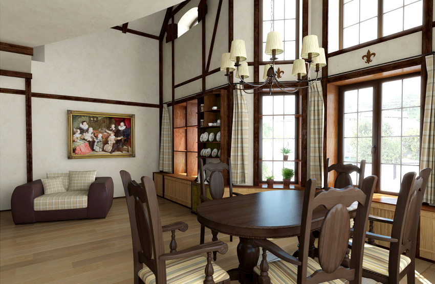 The features of German country are the abundance of beams and racks for logs in the decoration of the walls, ceiling