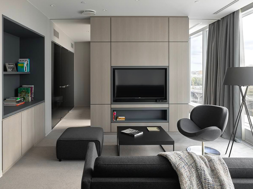 The best option for the minimalist style is transforming furniture, for example, a sofa bed mounted in the wall of a wardrobe. Such designs save space. Built-in household appliances are often used for the same purpose.