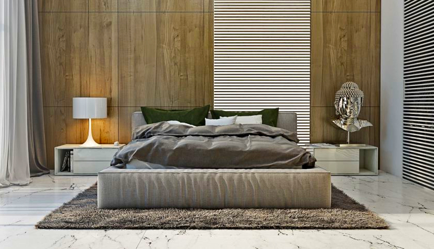 The laconic shape is the main feature of the minimalist bed. The bedroom, which has a wide bed with a wooden headboard, looks beautiful, stylish and cozy. This model is preferred by most designers. Next to it, functional pedestals look advantageous, on which strict lamps can be placed.