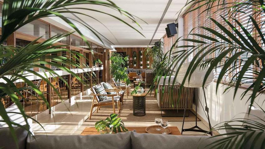 Hi-tech. Exotic plants, clear geometry. Concrete, metal and composite materials are used in the design. Such a garden is a great addition to an office.