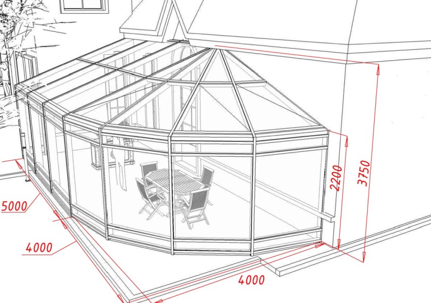 - The creation of a project is a clear drawing of the schemes for the contiguity of the winter garden to the wall of the house, the dimensions of the structures and the intended material. Lighting, dimming, water supply and heating systems are planned. It is necessary to calculate the power of the racks and transoms.