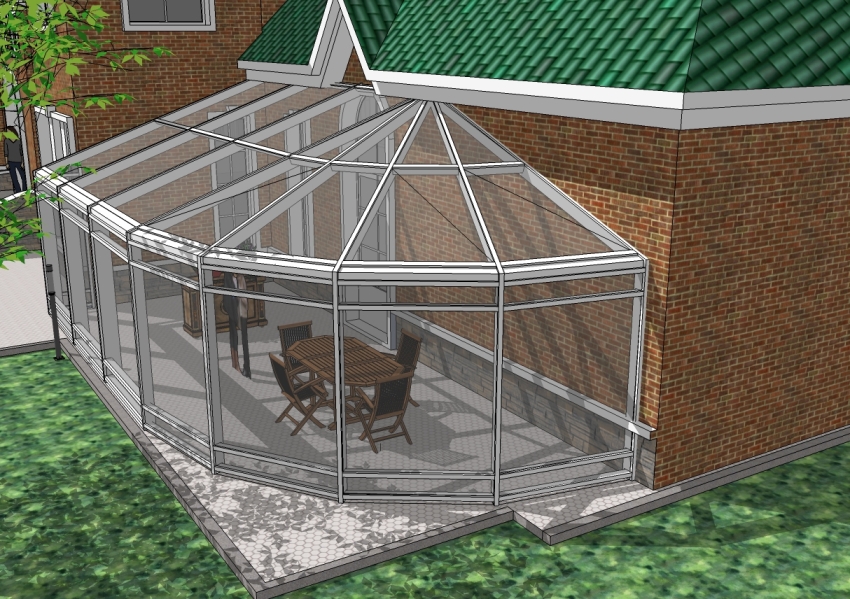 Rectangular winter garden-extension to the house. This design is a versatile and most popular option. The building has a transparent pitched roof.