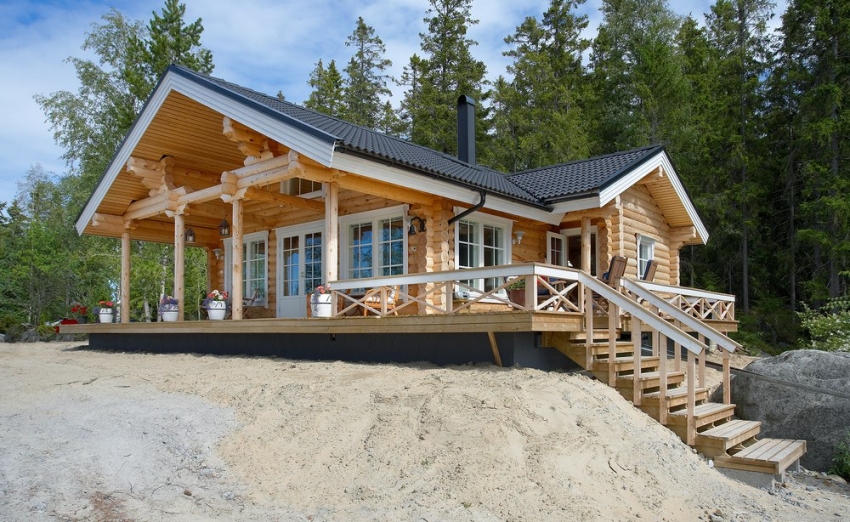 For those who wish to create a comfortable place for a summer vacation, there is an opportunity to buy a log sauna with a terrace or veranda. This is especially true for small areas. The relaxation area can be transferred to the terrace or veranda, thereby increasing the size of the steam room and shower. Photos of projects of a bath from a log clearly display various options for the execution of a log house. It should be borne in mind that this is a good option only for the warm season.For the winter period, the veranda or terrace should be insulated.