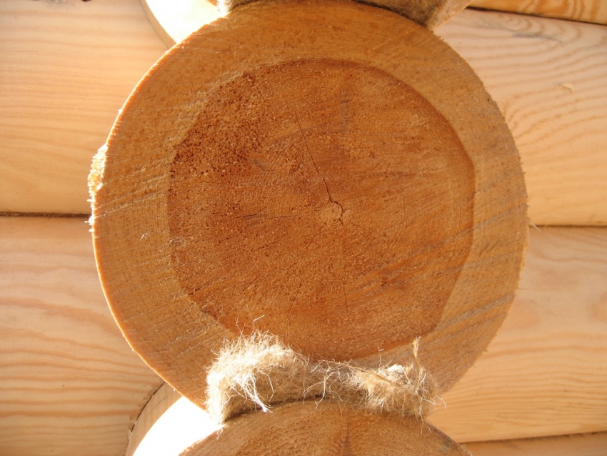 The logs for laying each subsequent crown should be of approximately the same diameter. Here you should alternate the thin and thick sides of the products in order to exclude the skewing of the structure. Between them, a heat-insulating material is placed, which is attached to the frame with staples, which counteracts blowing through the joints of the products. This can be moss, hemp, linseed tow, felt or jute.