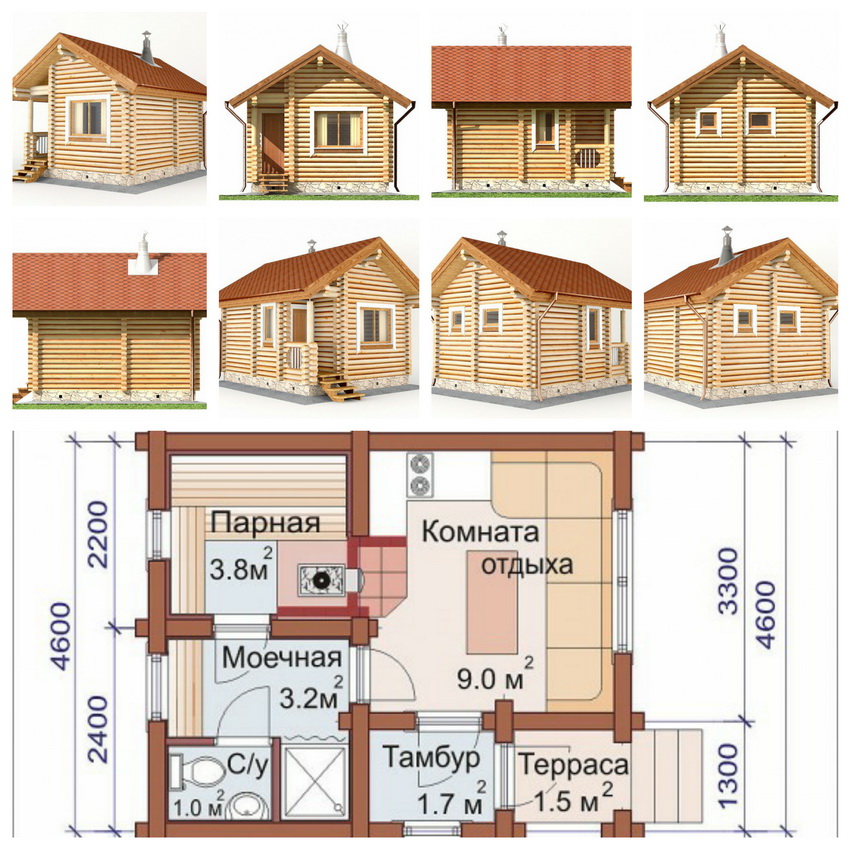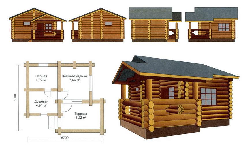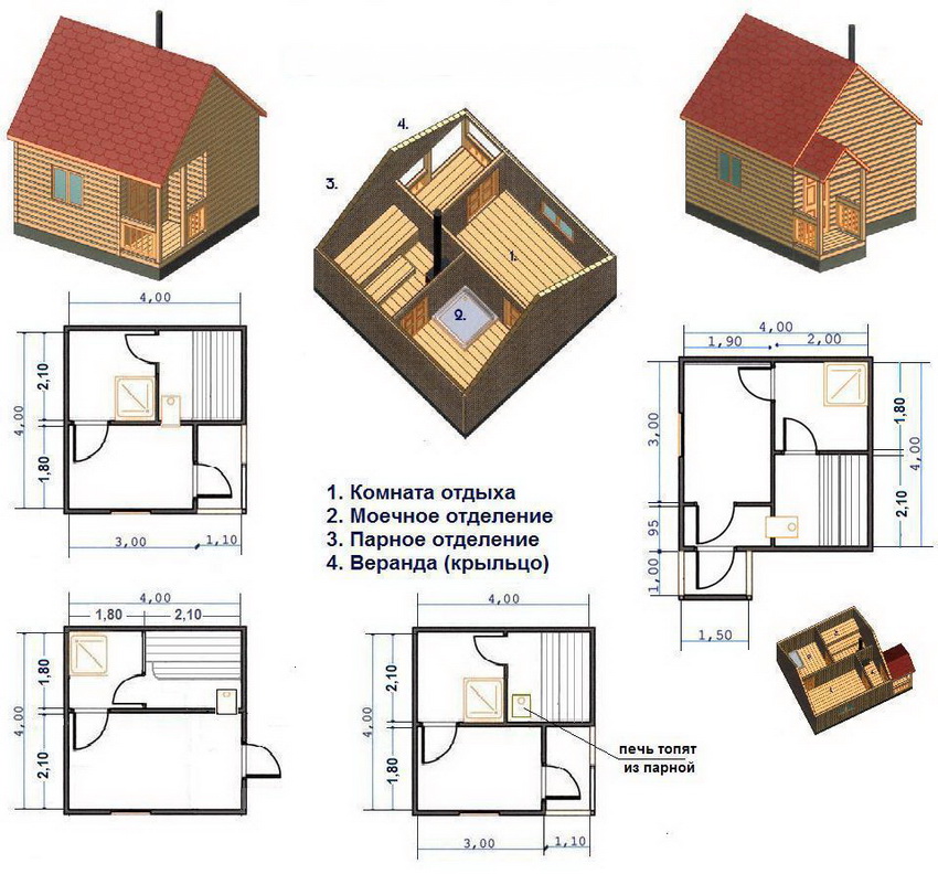 In order to avoid serious mistakes, it is advisable to start planning the bath with drawing up a drawing of the future structure. With a lack of financial resources, projects of small wooden baths are most often used. If the internal area of the structure is limited to 3x4 m or 4x4 m, the free space should be used as much as possible. Typically, the layout includes a steam room, a sink and a relaxation room.