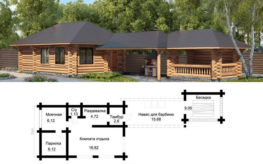 - 1.5 Popular projects of baths with a gazebo under one roof