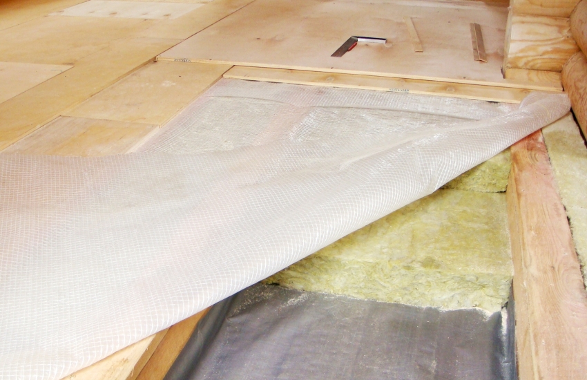 - the vapor barrier film is attached to the floor joists from the bottom side. At the same time, it is highly recommended that its edges are attached to the upper part of the walls. Since this is a very delicate material, it is important to work with it carefully, avoiding damage and tears;