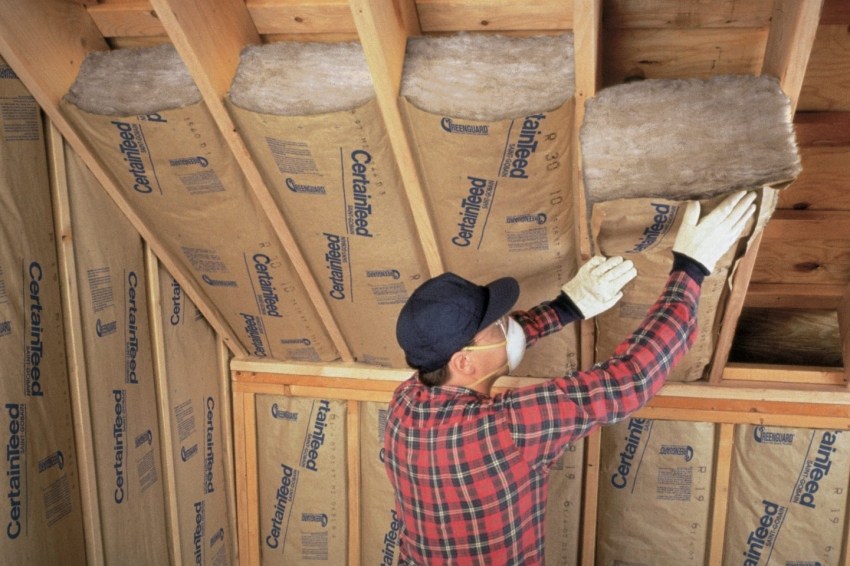 - mineral wool of suitable thickness is placed in the gaps between the beams based on the following standards: 150-180 mm for regions with a temperate climate, 200-250 mm for regions characterized by severe frosts. As with waterproofing material, the connection of two separate parts of the material must be overlapped;