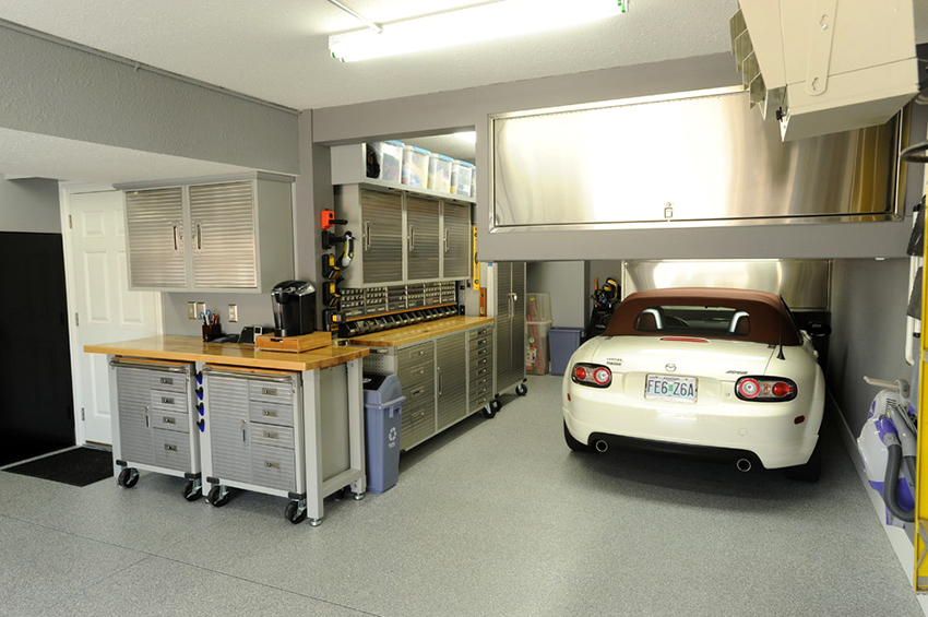 Decorating a garage interior requires knowledge of some of the nuances that make it possible to do this work as correctly as possible. For example, when choosing shelving for storing things, you must first take into account their height and the distance between individual shelves. Any furniture is placed around the perimeter of the room, as this allows you to leave a free passage for the owner of the car.