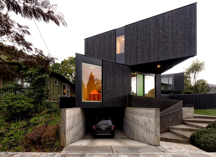 The location and design features of the built-in garage allow you to get into it straight from home. The entrance part faces the street and should be located near the road exit. Most often, built-in varieties can be found in suburban buildings.They are usually brick-built. Photos of garages of this type allow you to evaluate the compactness and efficiency of this structure, built into the house.