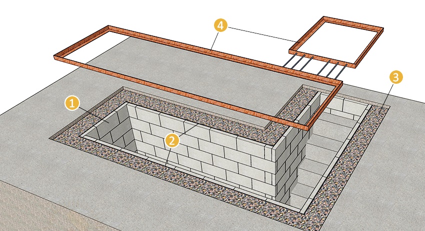 The next stage in the arrangement of the pit is to cement its bottom. In this case, a monolithic foundation is suitable, the layer of which is determined by the characteristics of the soil. The standard version is 3 cm.
