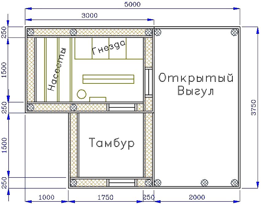In the drawings of the chicken coop with your own hands, do not forget to take into account the walking enclosure. Its proportions are directly related to the size of the poultry house itself: with a chicken coop width of 2 m, the minimum parameters of the aviary are 2x6 m.