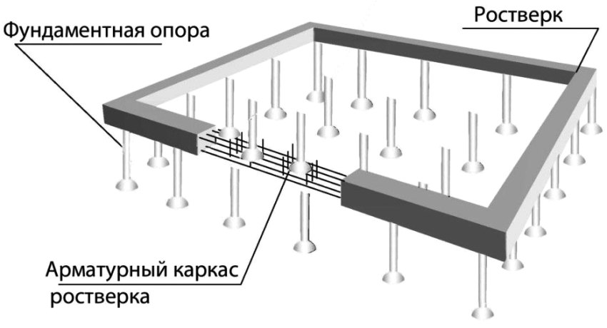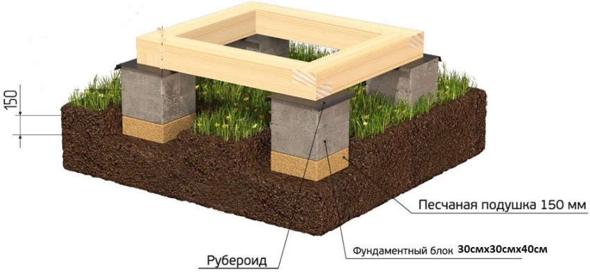 Filling is carried out both from the outside of the pipes and inside them. First you need to do the installation of the anchor rod. After the concrete hardens, the frame of the lower trim for the booth is formed. For these purposes, a wooden bar can be used. Holes are drilled in it for mounting the studs. Then, using nuts, the frame is tightly attached to the base piles.