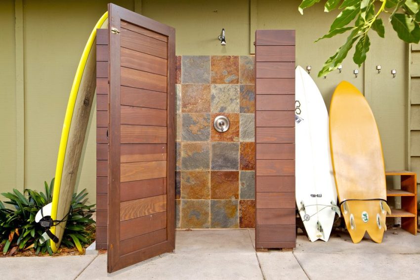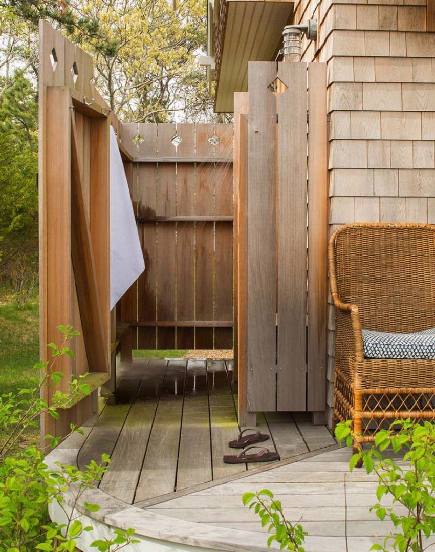 Any material is suitable for the construction of an outdoor shower room, but the most organic and inexpensive will use wood.