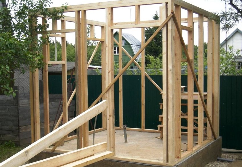 To hang the door, you will need to install two more additional posts in the front of the booth. These elements are placed between the corner posts. For their manufacture, you can take a bar with a section size of 5x5 cm.
