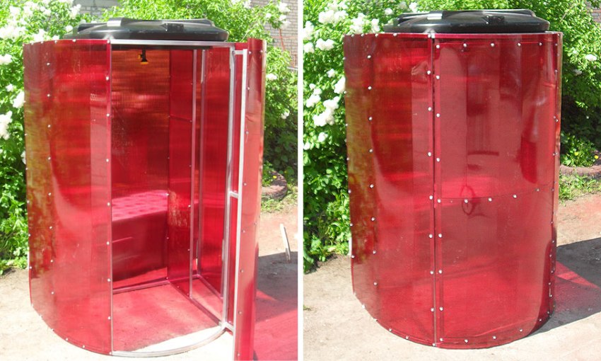 Since wood is subject to deformation changes under the influence of moisture, many land owners are thinking about how to make a shower in the country with their own hands from more practical and resistant materials, for example, polycarbonate. The frame part of the booth is made in the same way as in the case of a wooden shower room, however, a metal profile must be used as a material. The optimal section size is 4x6 cm.