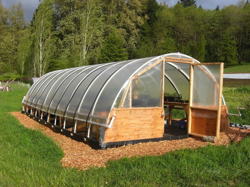 If you have the opportunity to allocate space and time for the installation of a stationary type structure, then you can consider more capital options, for example, a greenhouse made of a shaped pipe covered with polycarbonate or plastic film. Since such a structure is usually not dismantled for the winter, it must be strong and reliable enough to withstand severe wind loads and the weight of precipitation.