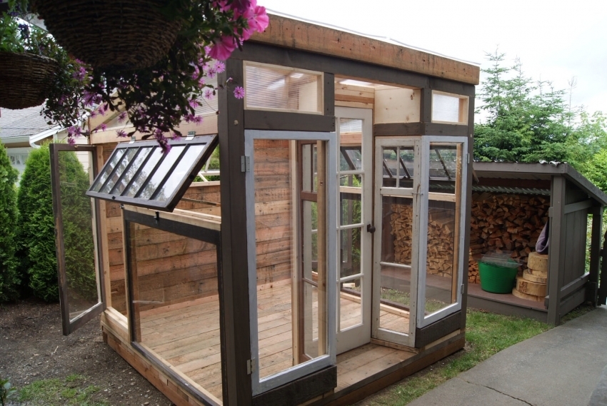 Building a tall greenhouse from old windows and doors allows you to install comfortable shelves for growing both short and tall plants.