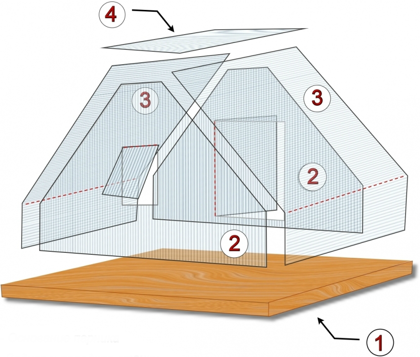Diagram of a mini greenhouse made of sheet polycarbonate (1 - greenhouse base; 2 - back and front walls; 3 - roof slopes; 4 - roof top)