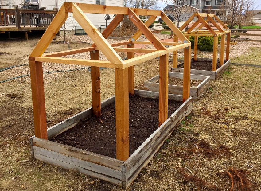 Depending on the type of roof, structures of this type are divided into arched, single-pitched and gable. Consider the simplest option - single-slope. Such a frame is easy to assemble from wooden beams, first fastening the side parts of the structure with self-tapping screws.They are triangles, the lower part of which corresponds in size to the width of the prepared foundation pit.