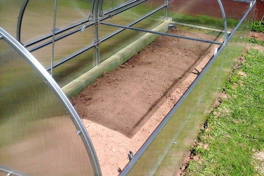 This type of greenhouse must open, and therefore it is worth taking care of the presence of folding doors on the end parts of the structure. The bottom, which is made of plywood, needs to be covered with a film and covered with a layer of manure and soil, which will be an excellent breeding ground for the root system of plants.