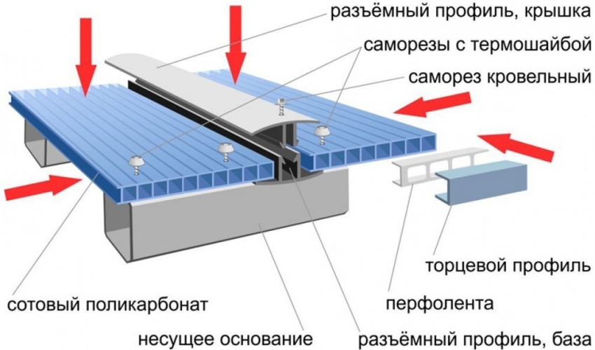 The main method of fastening, which is recommended by polycarbonate manufacturers, involves the use of profiles for this purpose. This solution allows to ensure tightness of the finished structure, and also guarantees the reliability of fastening better than others. Of course, this is not a very cheap method, and certain financial costs will be required to implement it, but all the connections will be made with high quality.