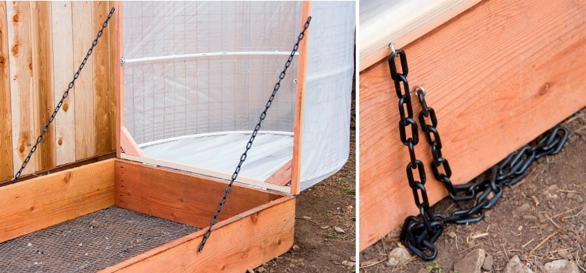For convenience, a low greenhouse can be made with an opening top by securing the two parts with rope and chain