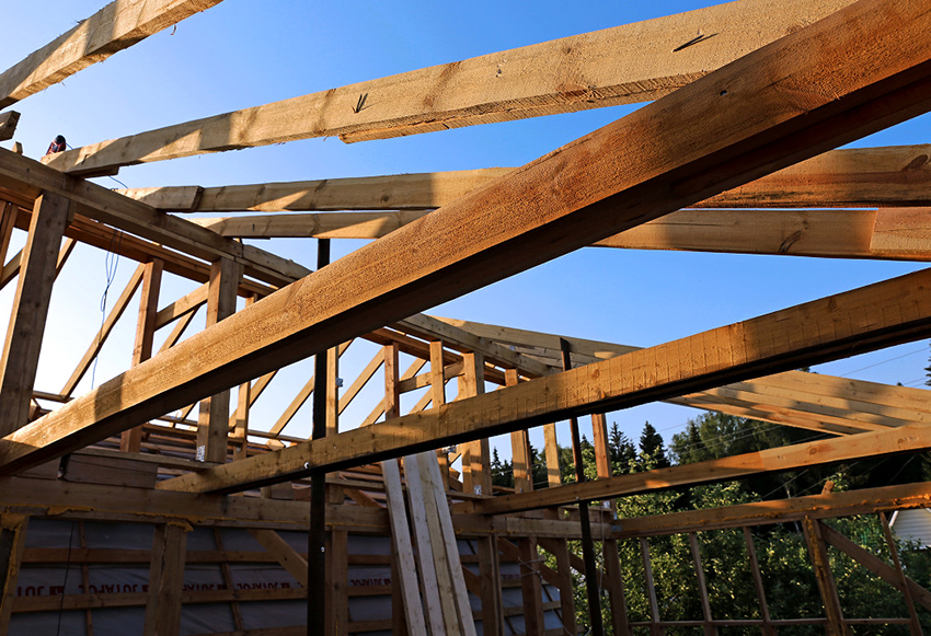 With the help of metal studs, a Mauerlat in the form of a wooden bar with a section of 50x150 mm is attached to the upper row of masonry. The distance between the studs should not be more than 120 cm. The extreme trusses are installed on the Mauerlat, which form the pediments. For ease of installation, the rafters are assembled on the ground and then lifted for installation. All elements should be connected to each other using metal fasteners and overlays. The installed rafter structure is covered with a waterproofing membrane, on top of which the crate is stuffed. The selected roofing material is attached to it.