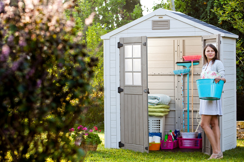 Such a beautiful shed is made of frost-resistant composite plastic, which is characterized by strength, wear resistance, reliability and practicality. The material is resistant to sunlight, moisture, does not corrode and attack by harmful insects, mold and mildew do not form on it. Despite its low weight, such a structure is capable of withstanding constant and prolonged loads. For a long service life, plastic, unlike wood, does not need to be treated with special compounds. With proper use, such a building will last at least 15 years.