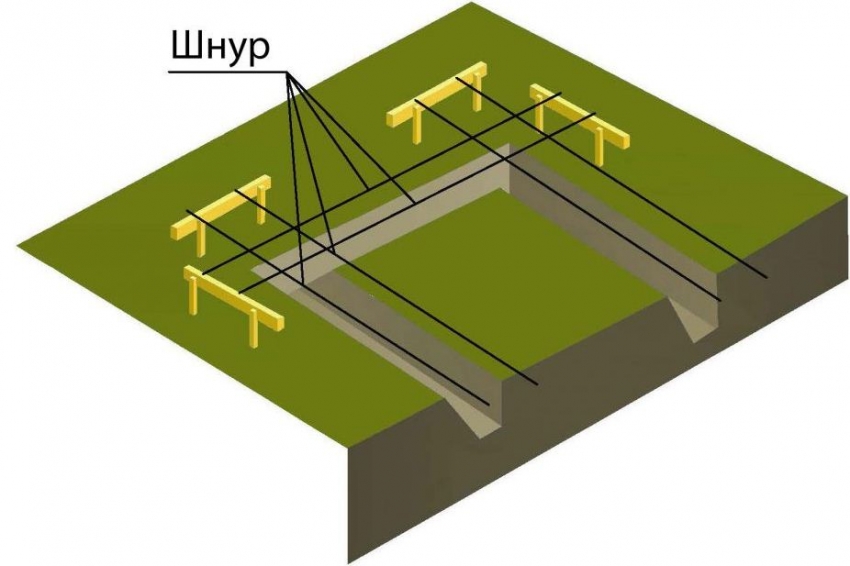 To make it easier to work with the markings, it is recommended to install wooden structures in the corners that resemble small benches. They are exposed on the same plane. The height of these structures must correspond to the height of the formwork, which will be erected later. A measuring cord is attached to them.