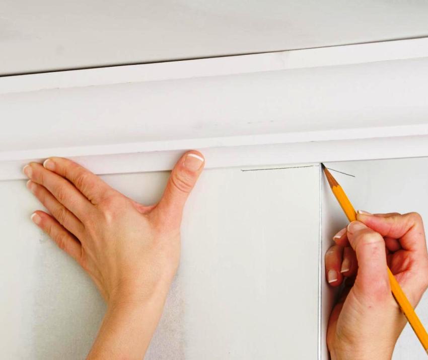 You need to apply glue only on the side of the baguette that will be applied to the wall. It is necessary to fix the plinth from the corners. Therefore, before attaching a baguette for stretch ceilings, you need to cut and prepare not only the starting angle, but all the others. Then you need to attach the resulting blanks. If you are satisfied with the docking, you can apply glue and apply to the wall. For a stronger adhesion of surfaces, hold the baguette for 40 seconds.