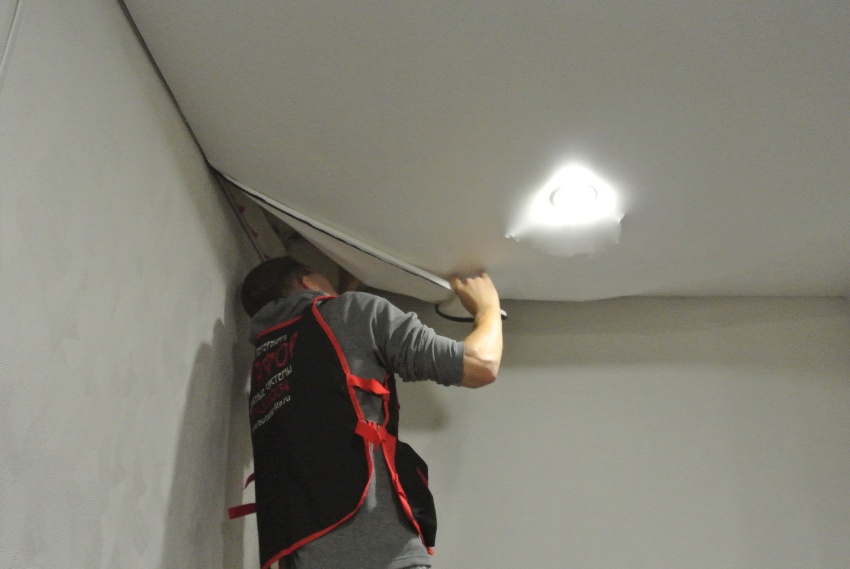 If the ceiling is rectangular, it is better to remove the canvas from the corner. Do not touch unheated areas. If a wedge system was used, remove the glazing beads. With the harpoon attachment method, it is required to carefully remove the canvas, that is, to release the film. "Clips" need to be unclenched, gradually pulling the canvas.