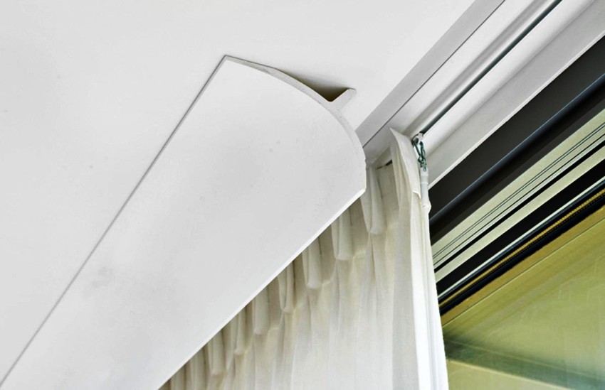 Fixed baguettes for curtains, for a stretch ceiling (the photos clearly demonstrate this) seem to be glued from above. There is only one way to provide such an effect: cut the trellises so perfectly that not even a hint of unevenness remains. What result can you expect?