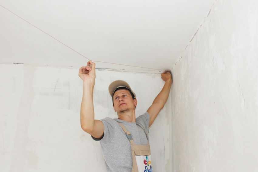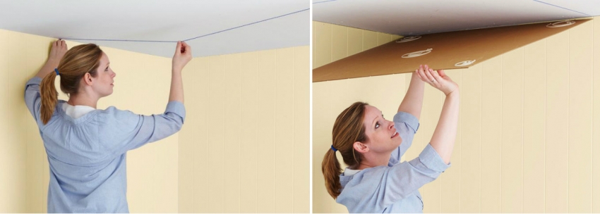 For even finishing the ceiling with tiles in the form of rhombuses or a checkerboard, you should divide the ceiling into parts and mark them additionally