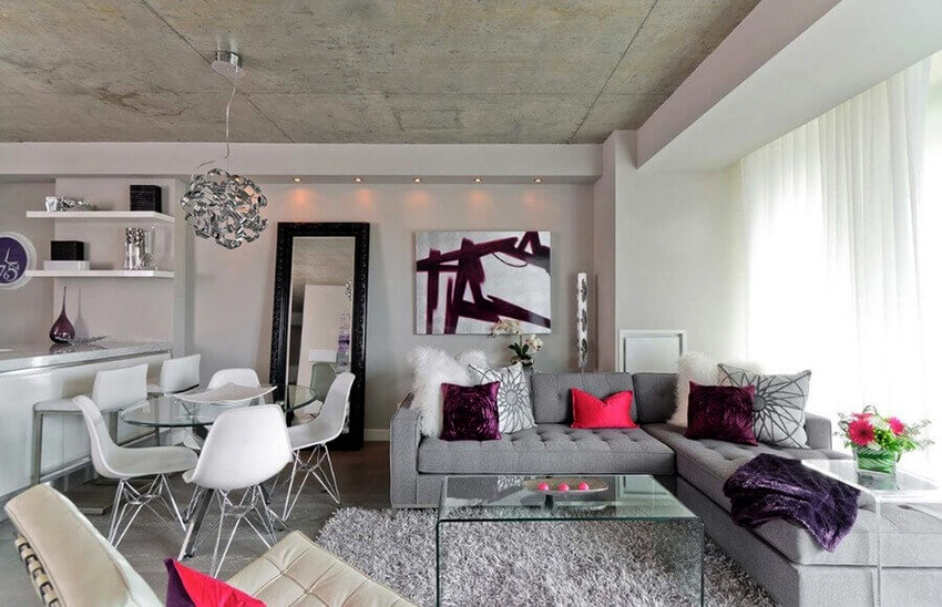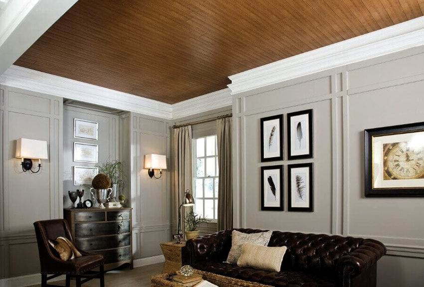 - Suede material. This kind of fabric is very close in texture to natural suede. The soft texture dampens the light and distributes it throughout the room. Interiors with suede ceilings look elegant, noble and expensive.