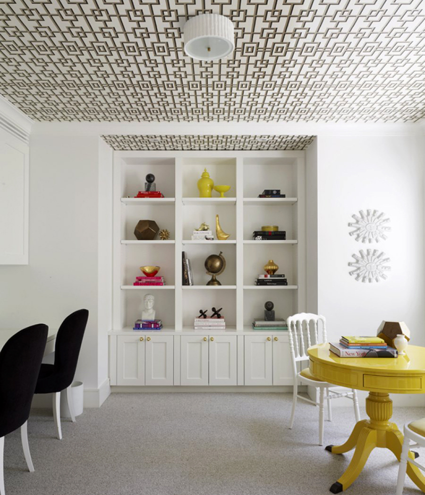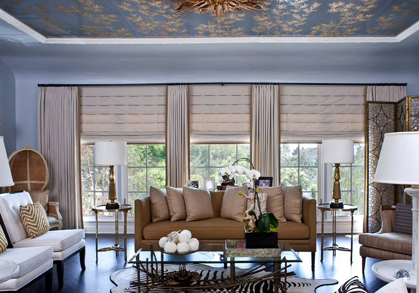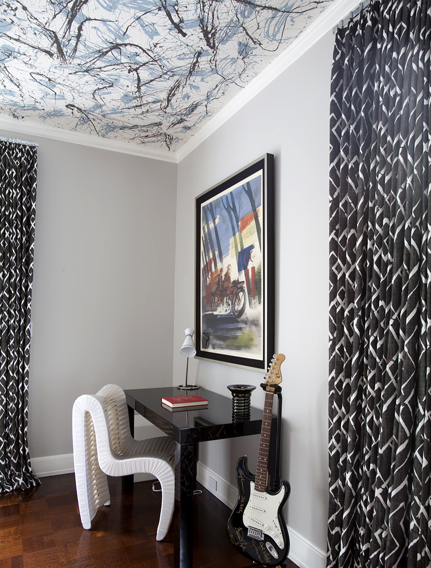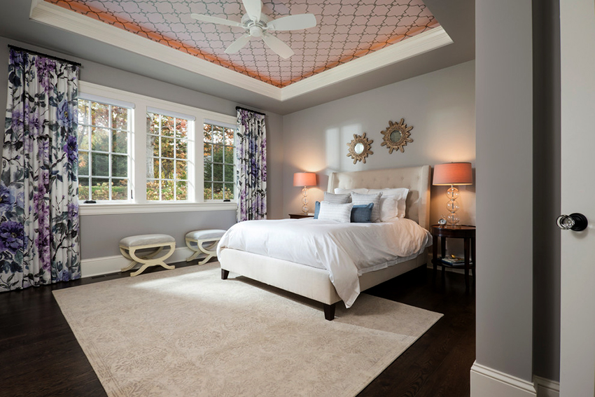 This surface design option will help you to abandon the installation of a classic central lamp. You can solve the issue of high-quality lighting in the room with the help of several small ceiling lamps. Other advantages of chintz fabric include the following points: