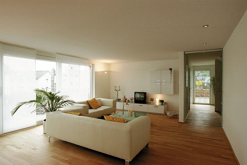 The resulting fabric is rolled into rolls and sent for further styling. The width of the fabric can be up to 5 m, which makes it possible to exclude welded seams even in fairly spacious rooms. The installation is carried out using a safe technology without the use of heat guns, which can also be considered an advantage over PVC films. When installing a fabric stretch ceiling, the covering is fixed with reliable mechanisms at the highest point of the room. This structure looks as if it is covered with plaster and painted in one color with high quality.