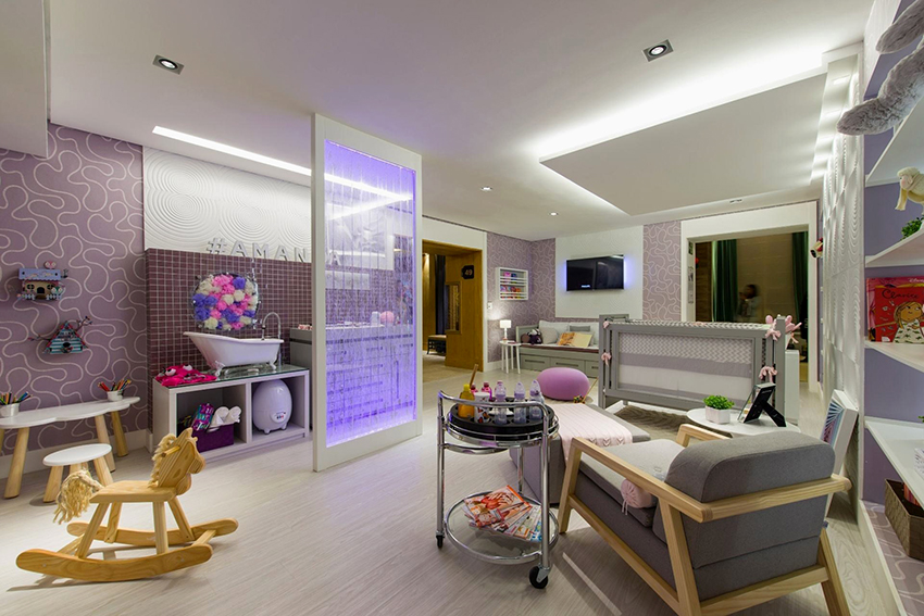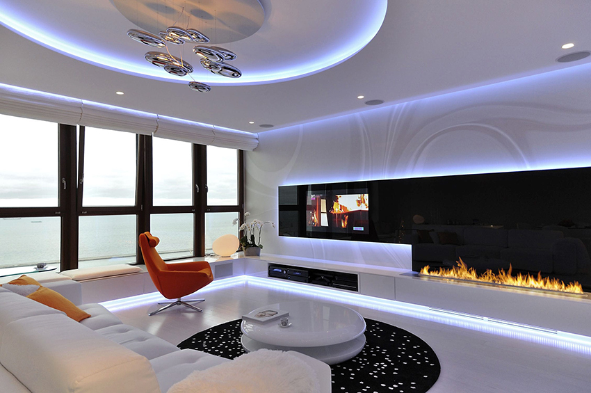 To create a special effect, you can think of a pattern on the ceiling with a built-in LED strip that frames some part of the canvas or a certain large pattern. Diode light sources can be successfully combined with wall decoration. Designers consider it a good solution to illuminate a tension structure that smoothly passes onto the wall.