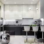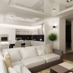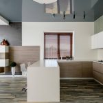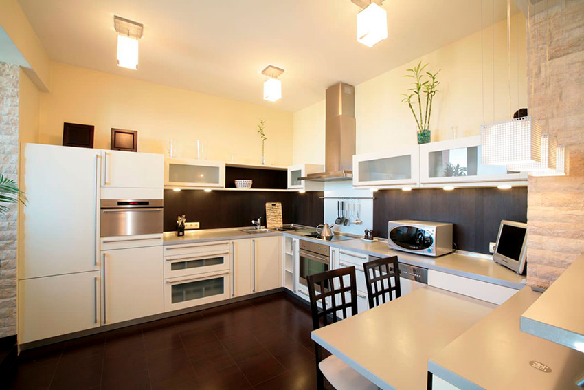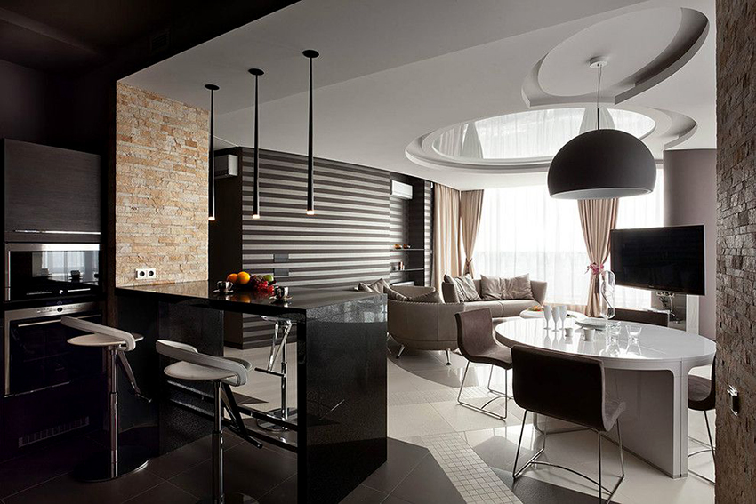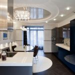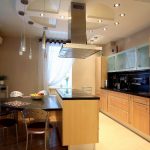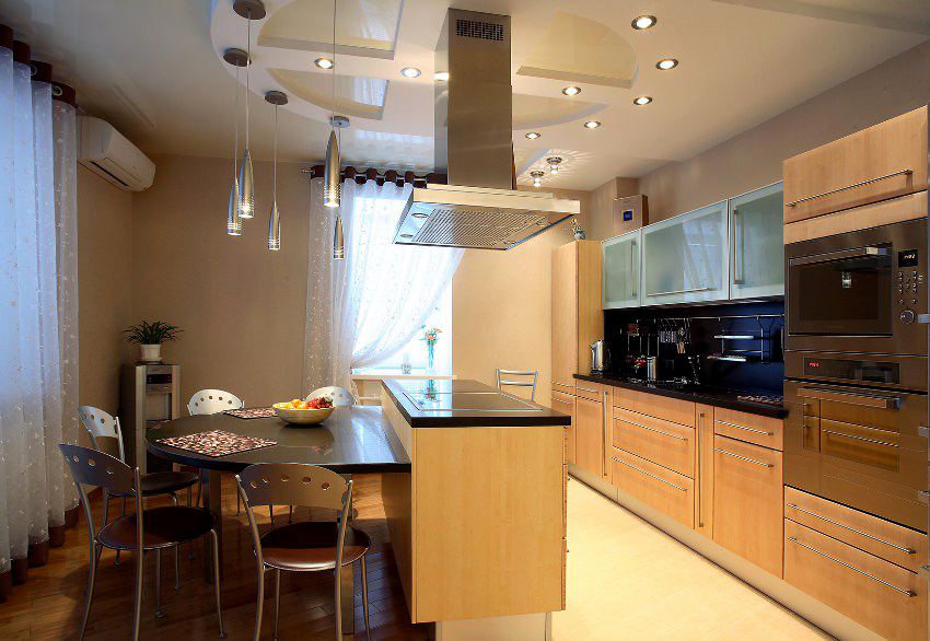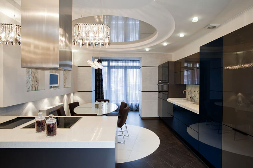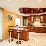 The design of the stretch ceiling of the kitchen can be performed in almost any style, and the ceiling itself can be multi-level, which will neatly hide any communications, if necessary. By using different levels and combining materials and colors, it is easy to divide the kitchen into functional spaces. Judging by the photo of stretch ceilings in the kitchen, it is most important to use multi-level ceilings in studio apartments, where the allocation of an area for relaxation, cooking and eating is a mandatory task.