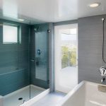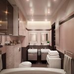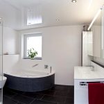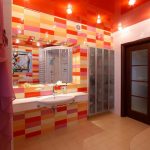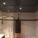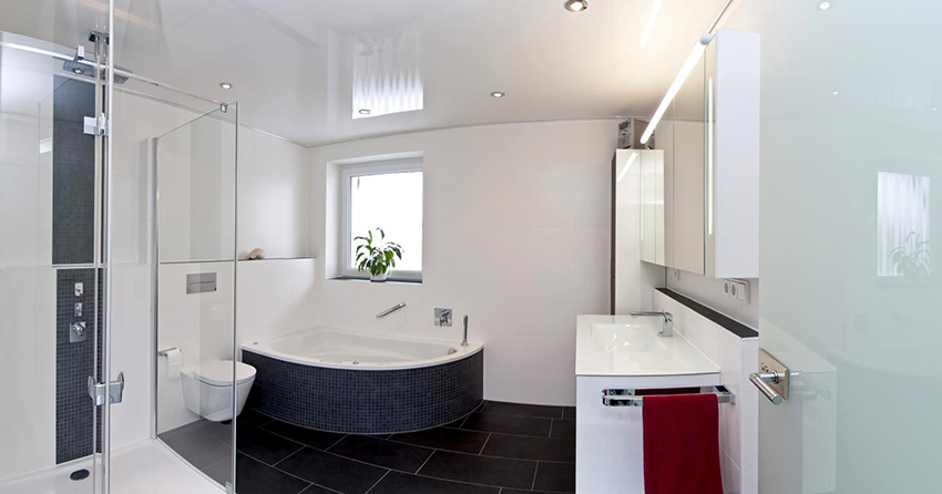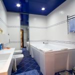 A bathroom is a room with high humidity and constant temperature fluctuations, therefore, when choosing a stretch fabric, it is better to give preference to PVC film, which can not lose its original appearance for 10 years or more. To prevent water droplets from being visible on the stretch ceiling in the bathroom, it is recommended to choose satin or matte canvases, although condensation will not collect on glossy materials.