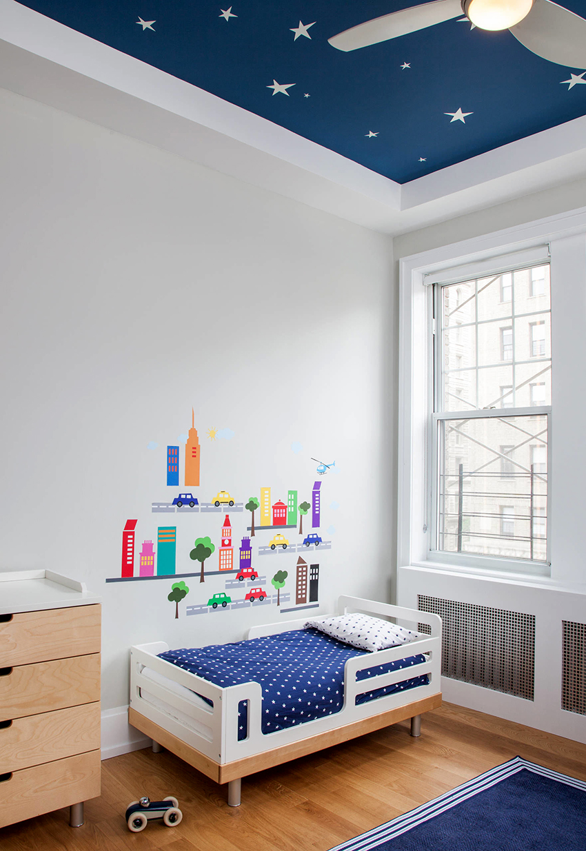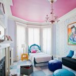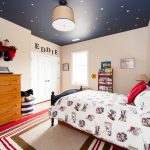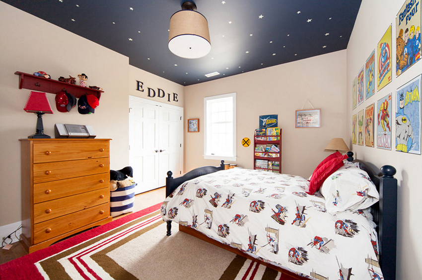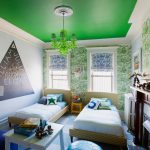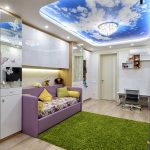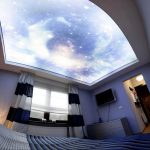 A common design option for a single-level ceiling is the starry sky, which looks spectacular not only in the nursery, but also in the bedroom. If you use different versions, you will be able to achieve the effect of a floating ceiling using halogen or diode lighting. Using a fluorescent dye or fiber optic, you can create truly twinkling stars. When it comes to visual zoning, designers prefer to use a multi-colored canvas.