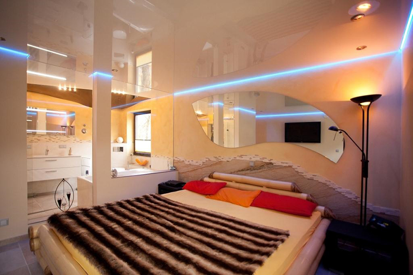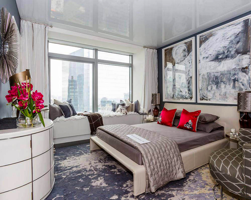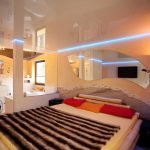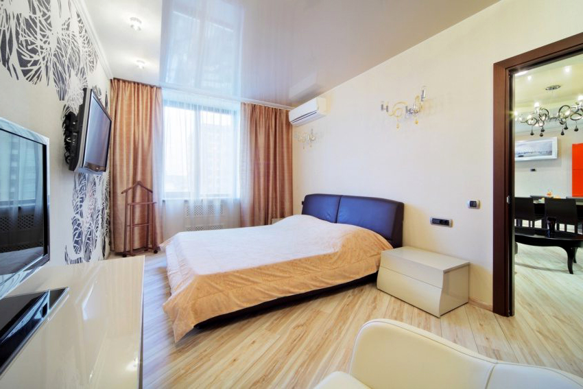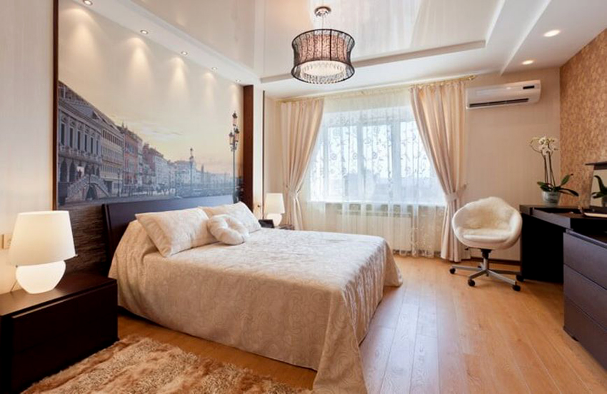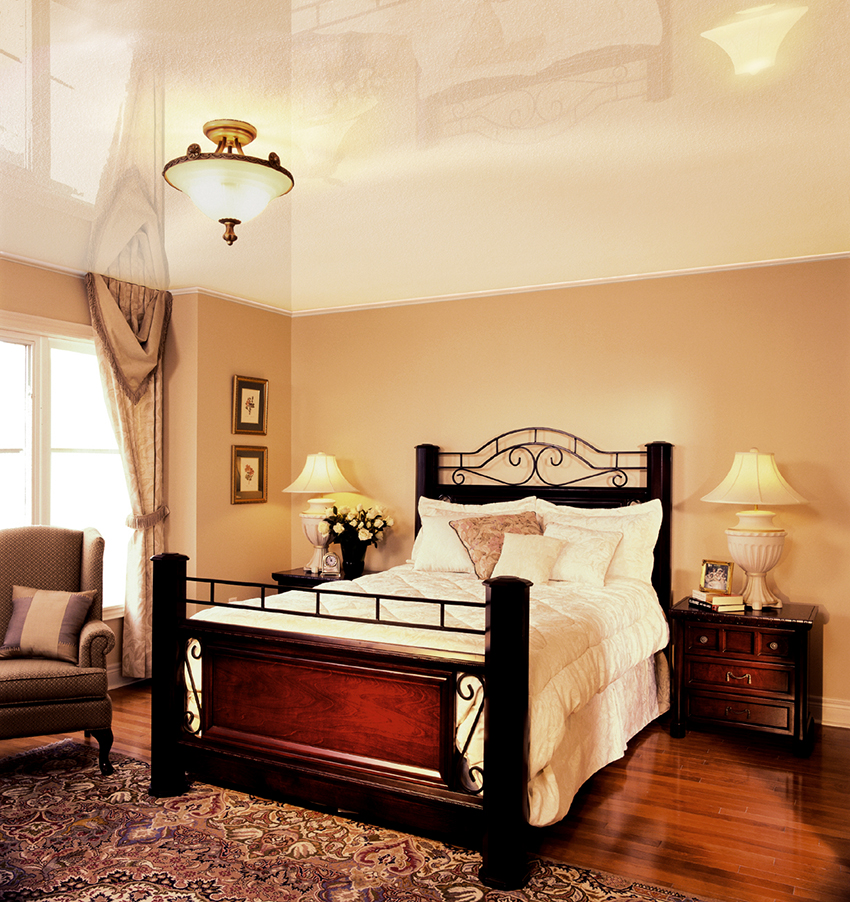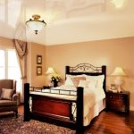 When decorating a bedroom, it should be remembered that the main purpose of a room is rest and relaxation. Therefore, the interior should be calm, pacifying and attuning to a restful sleep. You should not install glossy ceilings in the bedroom, because the light of lanterns or car headlights will bounce off the surface, which will become a source of unnecessary glare at night.